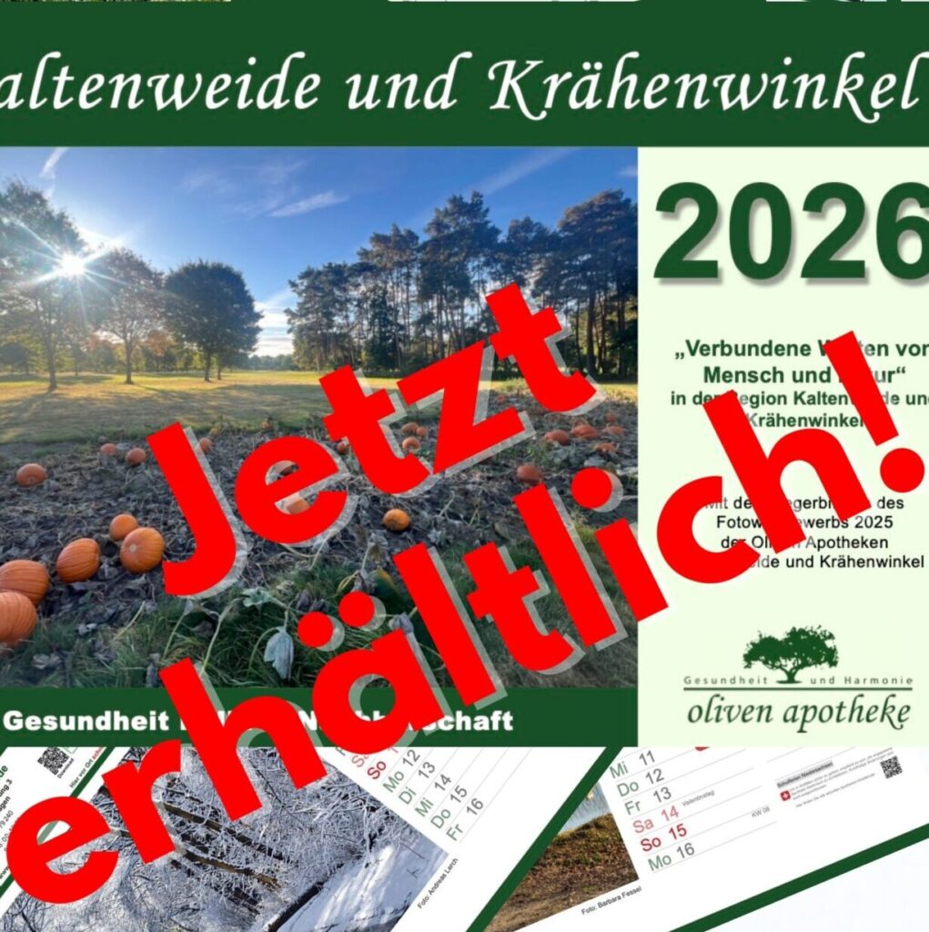 Vielfältige Begegnungen von Mensch und Natur in dem neuen Kaltenweide & Krähenwinkel Kalender 2026! Alle von der Jury prämierten Fotos des Fotowettbewerbs 2025 in einem schönen, vielseitigen und interessanten Kalender für das Jahr 2026, mit den Notdiensten der Oliven Apotheke und den wichtigen lokalen Terminen.